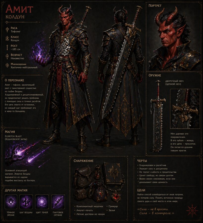 Тифлинг Колдун HexbladeКраснокожий тифлинг с двумя рогами и двуручным мечом за спиной. Саркастичный герой в кроваво-ангельской эстетике.
