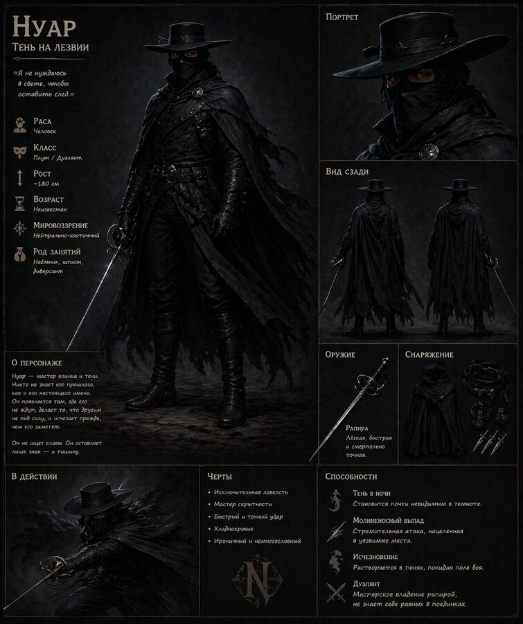 Неизвестно ТеньЗорро-подобная фигура в чёрном: плащ, широкополая шляпа и чёрная бандана, закрывающая нос и рот.