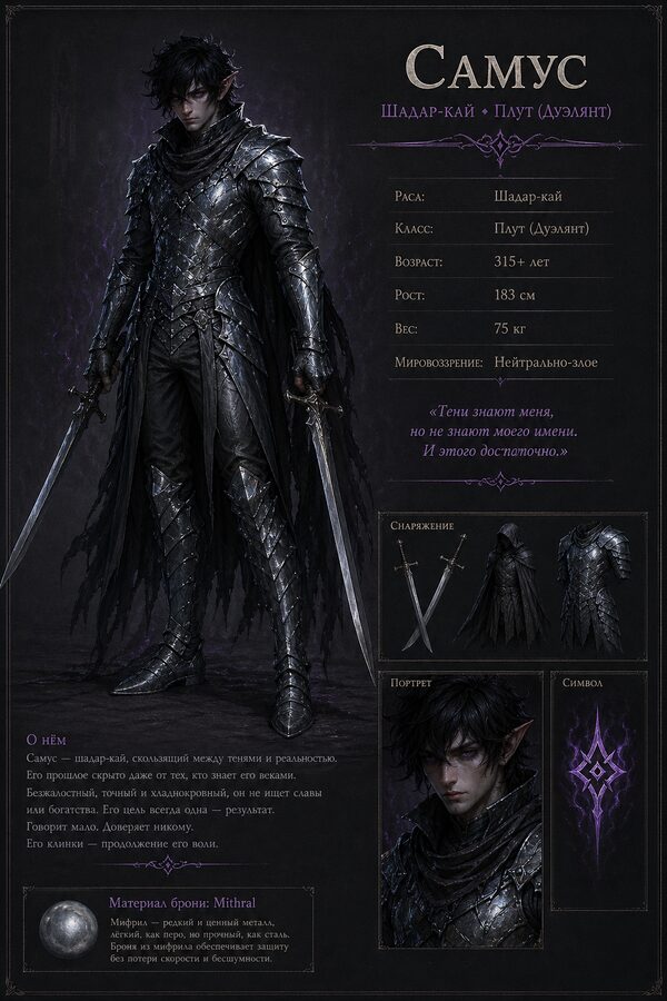 Шадар-кай Плут-дуэлянтМрачный дуэлянт 315+ лет. Броня цвета адамантия, короткие мечи по бокам, взгляд из варпа.