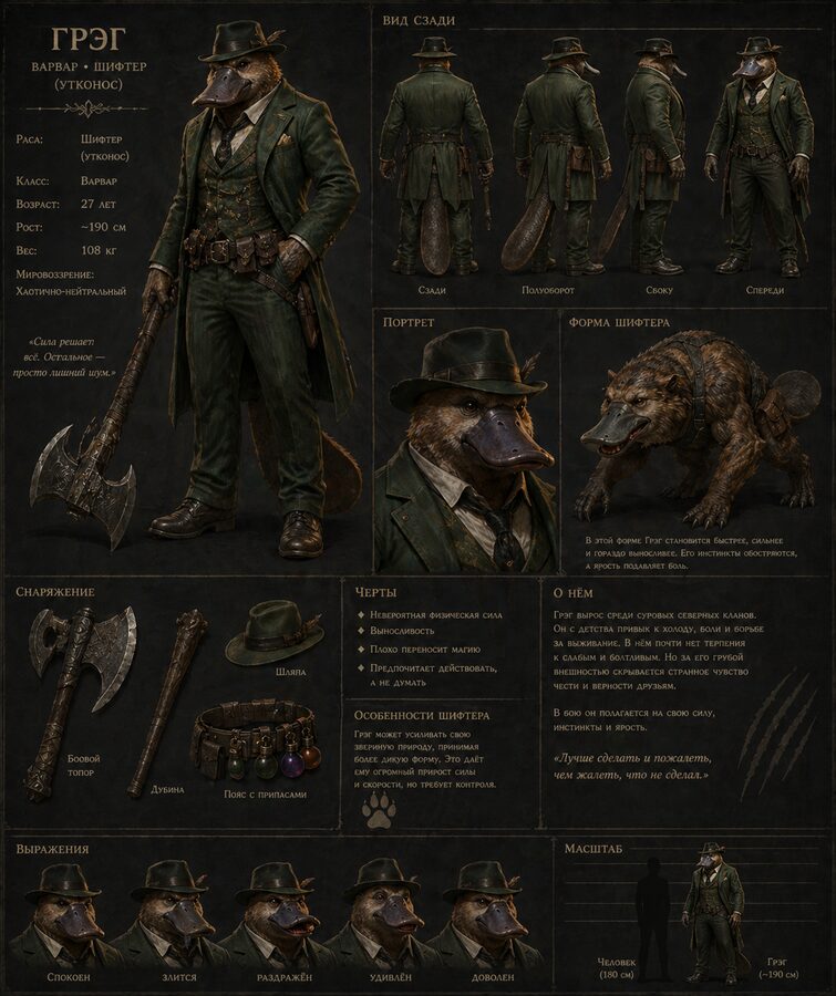 Шифтер ВарварВарвар в стиле викинга: длинные светлые волосы, шрамы, меха, топор и очень большие губы. Выглядит сурово, но часто попадает в абсурдные сцены.